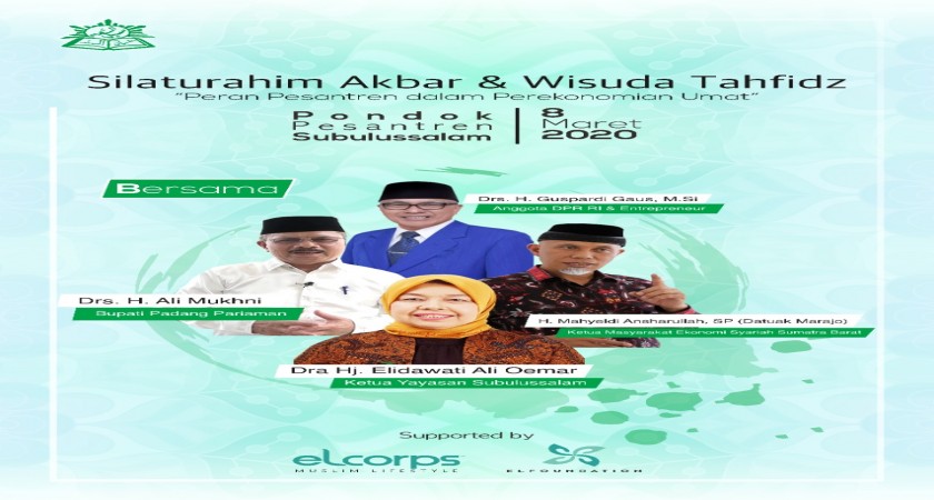 Pada hari Ahad tanggal 18 Maret tahun 2020, Pondok Pesantren Modern Subulussalam melaksanakan acara "Silaturahim AkbarWisuda Tahfidz" untuk tingkat MTs dan MA. Acara ini di hadiri oleh Anggota DPR RI & Enterpreneur Drs.H.Guspardi Gaus,M.Si, Wakil Bupati PadangPariaman Suhatri Bur,SE,MM, Ketua Masyarakat Ekonomi Syari'ah Sumatera Barat H. Mahyeldi Ansharullah,SP , Ketua Yayasan Pondok Pesantren Modern Subulussalam Dra.Hj.Elidawati Ali Oemar beserta orangtua/wali santri wisudawan/wisudawati Pondok Pesantren Modern SUbulussalam.