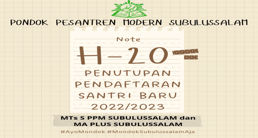 H-20 Penutupan Penerimaan Santri Baru Tahun 2022/2023 MTs PPM Subulussalam dan MA Plus Subulussalam - Memasuki pertengahan tahun pelajaran 2021/2022, pengumuman dan informasi pembukaan pendaftaran siswa baru di masing-masing sekolah mulai tersebar. Mulai dari tingkat PAUD, tingkat SD/RA sederajat, tingkat SMP/MTs sederajat, tingkat SMA/MA Sederajat, bahkan Perguruan Tinggi. Selain sekolah umum, Pondok Pesantren juga sudah mulai menyebar informasi dan pengumuman terkait penerimaan santri baru. Salah satunya Pondok Pesantren Modern Subulussalam.