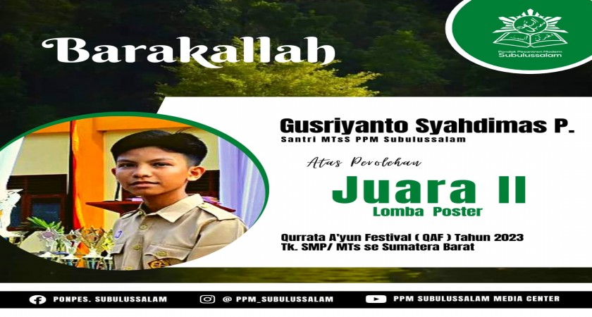 Santri MTs S PPM Subulussalam Meraih Juara II Lomba Poster Se-Sumbar 2023 - Santri MTs S PPM Subulussalam berhasil meraih juara II lomba poster tingkat SMP/MTs Se Sumatera Barat pada kegiatan Qurrata A'yun Festival (QAF) Tahun 2023. Juara II tersebut disematkan kepada ananda Gusriyanto Syahdimas Pratama. Santri kelas IX MTs S PPM Subulussalam.